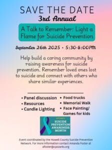 June 30, 2025 3rd Annual “A Talk to Remember: Light a Flame for Suicide Prevention” hosted by the Howell County Suicide Prevention Network wptourism2 Calendar Add to Calendar Add to Timely Calendar Add to Google Add to Outlook Add to Apple Calendar Add to other calendar Export to XML When: September 26, 2025 @ 5:30 pm – 8:00 pm 2025-09-26T17:30:00-05:00 2025-09-26T20:00:00-05:00 Where: West Plains Civic Center East Lawn 110 St. Louis St.