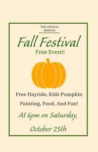 October 20, 2025 Annual Fall Festival wptourism2 Calendar Add to Calendar Add to Timely Calendar Add to Google Add to Outlook Add to Apple Calendar Add to other calendar Export to XML When: October 25, 2025 @ 6:00 pm – 8:00 pm 2025-10-25T18:00:00-05:00 2025-10-25T20:00:00-05:00 Where: Berean Baptist Church 7050 Co. Rd. 2570